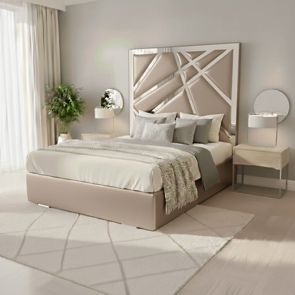 Elevate your bedroom with the Abstract Mirror-Trim Luxury Bed, designed for contemporary elegance and everyday comfort. The striking mirror trims along the frame reflect light beautifully, creating a sense of space and luxury.