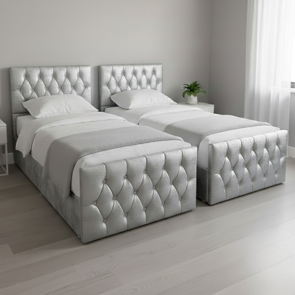 Add charm and sophistication to your space with the Blush Pink Double Diamond Bed. Upholstered in a soft blush-pink fabric, this bed features a stunning double-diamond headboard pattern with sparkling diamanté button detailing that instantly elevates your bedroom décor.