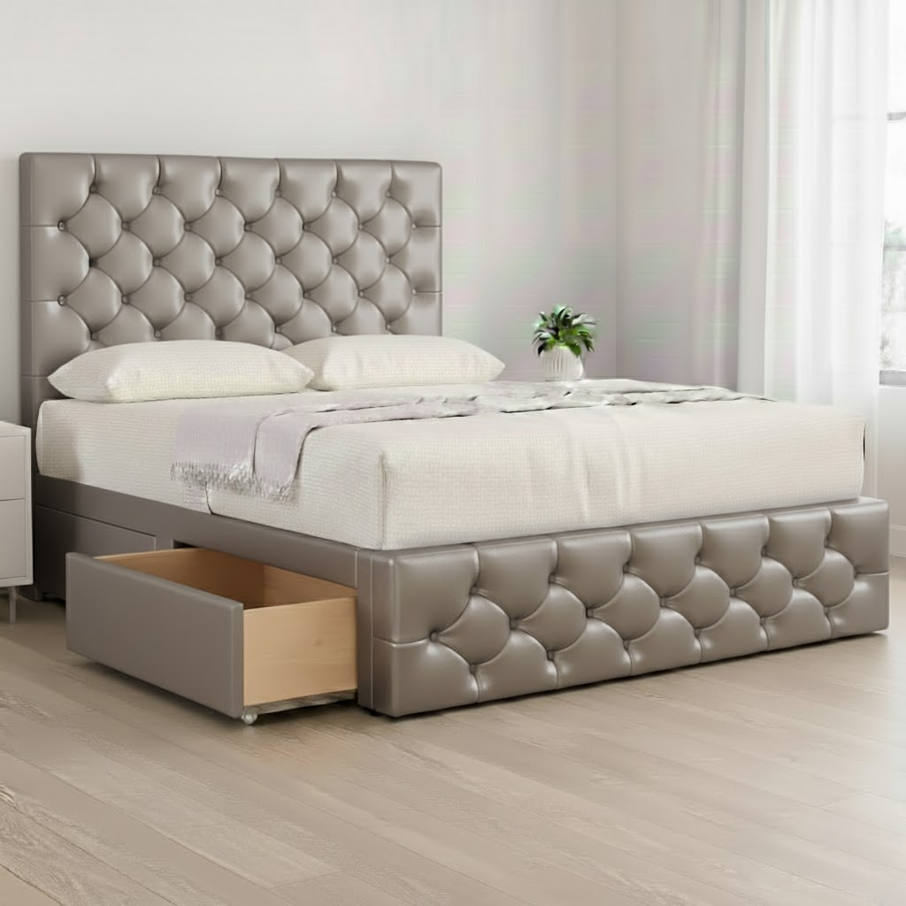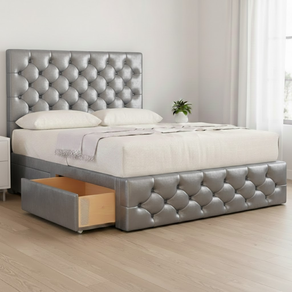 The Diamond Tufted Storage Bed combines luxury and practicality. Featuring a plush tufted headboard with sparkling diamanté accents and built-in storage, it adds elegance and functionality to any bedroom.