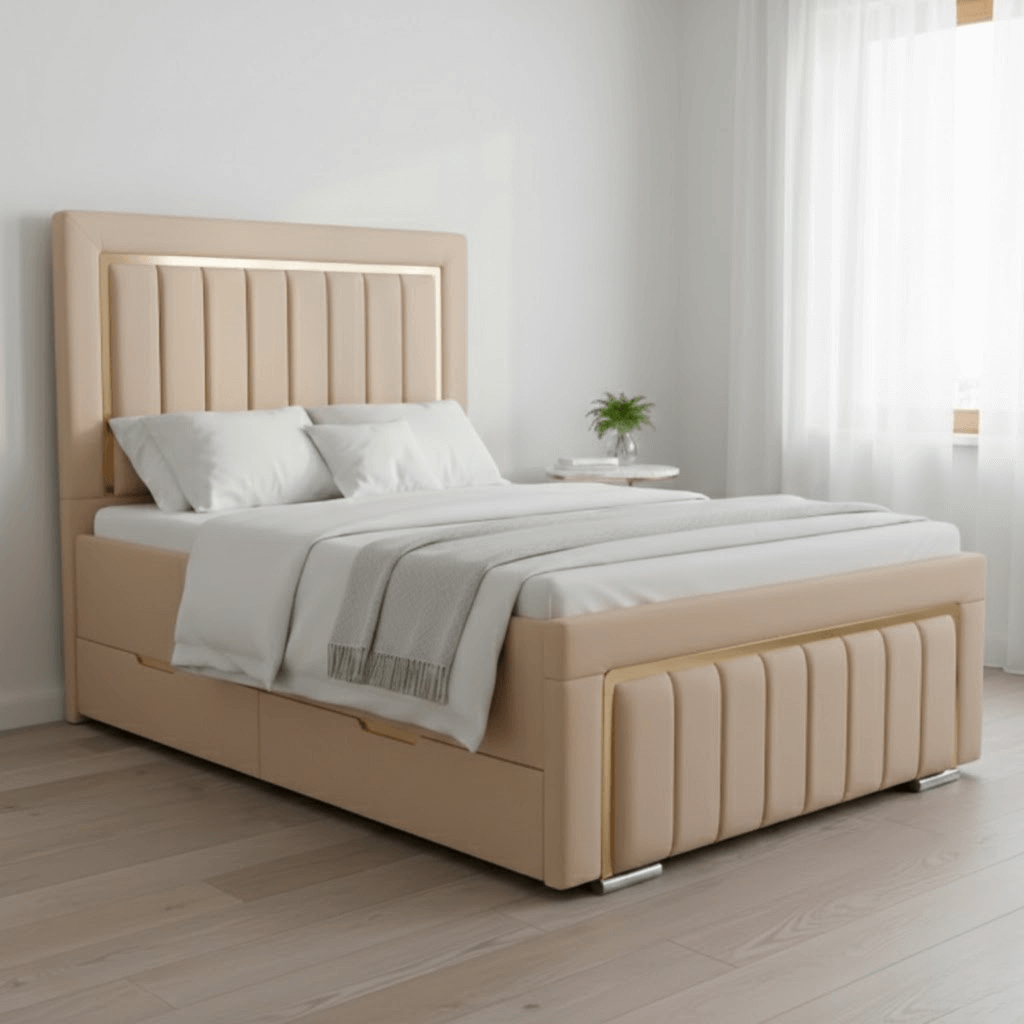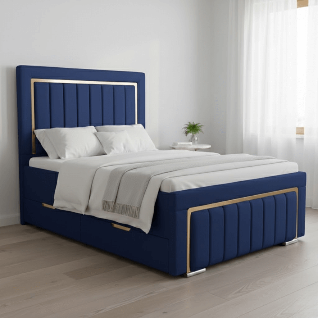 Transform your bedroom with the stunning Executive Gold Trim Linear Bed, designed to offer high-end style with everyday comfort. Upholstered in premium fabric and highlighted with sleek gold trim, this bed brings a luxurious, modern touch to any room.