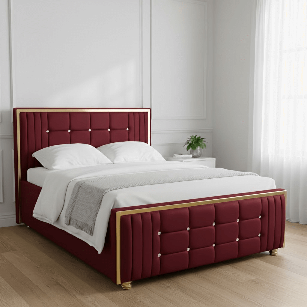Elevate your bedroom with the luxurious Gold Border Diamante Bed, designed to make a statement. The sleek gold border highlights the premium frame, while dazzling diamante details on the headboard add a touch of sparkle and sophistication.