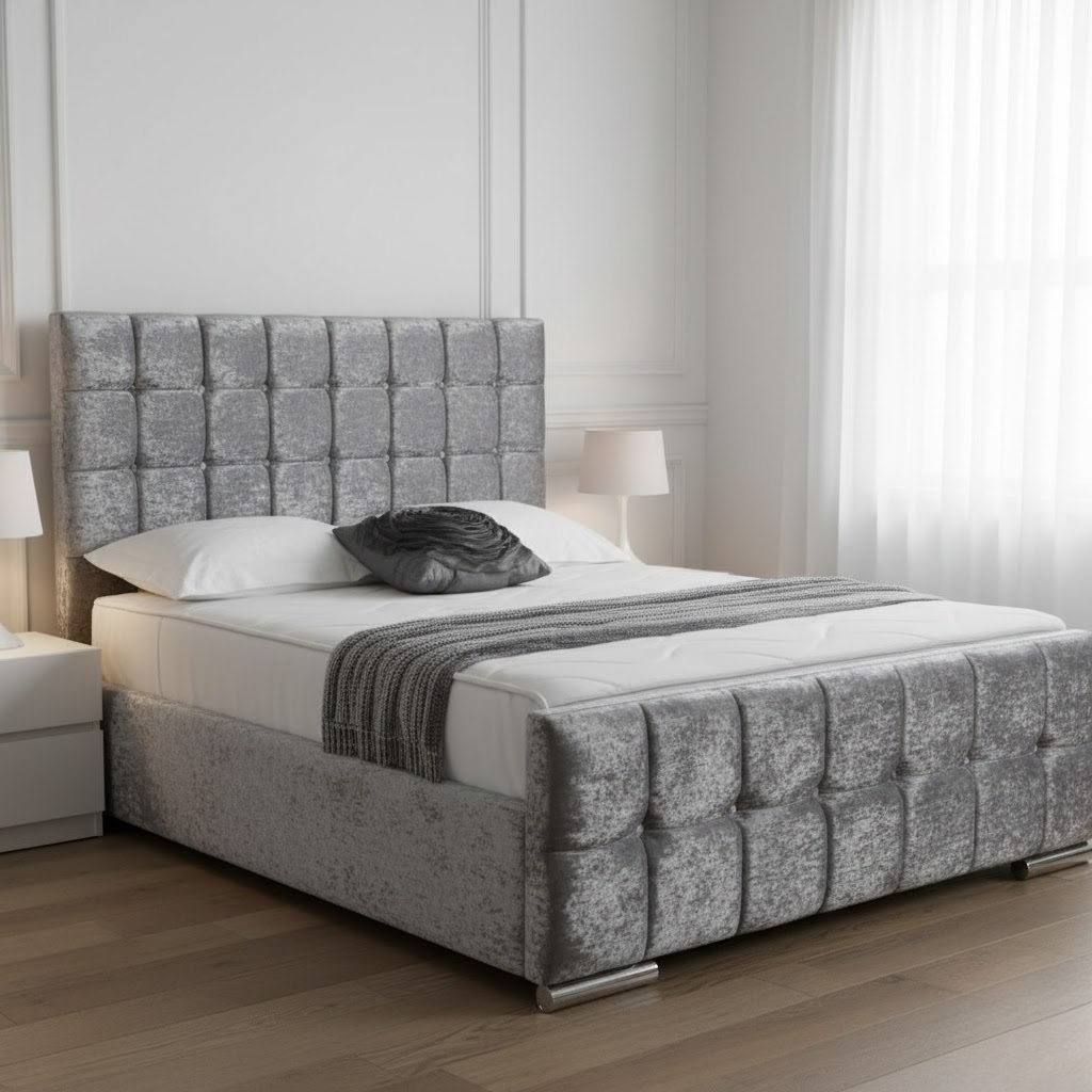 Upgrade your bedroom with the Silver Cube Velvet Frame Bed, crafted for those who love contemporary style paired with modern comfort.